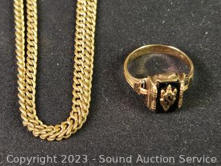 Ring S:6, marked 10K, other pieces are unmarked, possibly GF or GP all parts held on 10K acid test. TW: ring 3.7g, other piece 19.65g, All 23.35g.