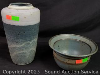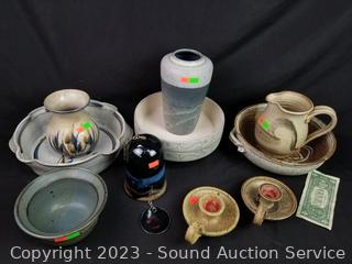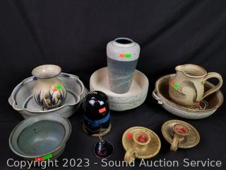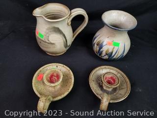 Pitcher, vases, bowls, candleholders. Most are signed.