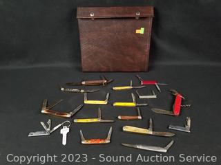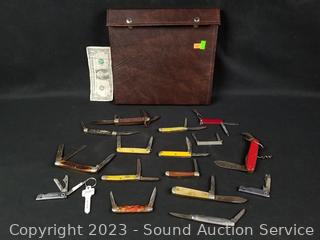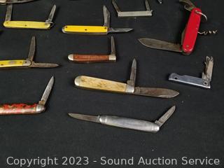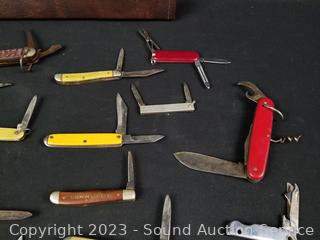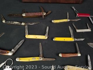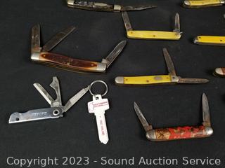By Ideel?, Imperial, Kabar, Schrade & others, hard to make, various wear from age, use.