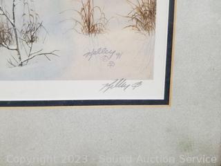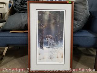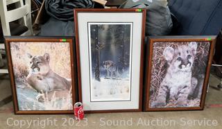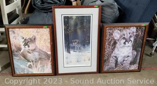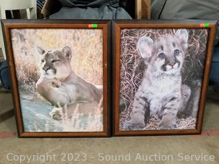 Cub, Cougar photos, 22.5" x 18.5". Kelley 1991 signed Wolf litho, 29" x 18.5". Some scuffs, wear to frame.