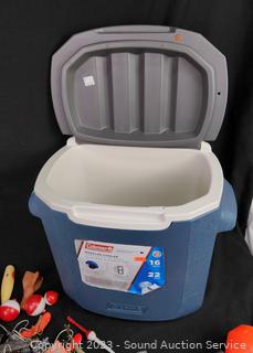 Rod rack, Flambeau tackle box with hooks, weights, fishing line, 16qt cooler, 14" H x 13" x 9".