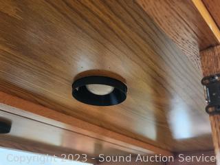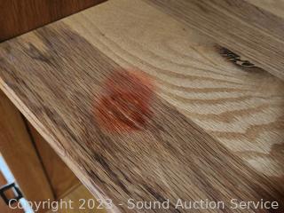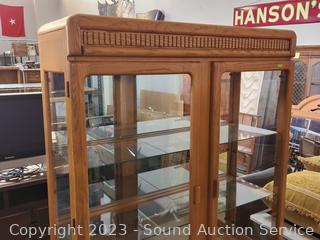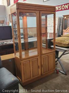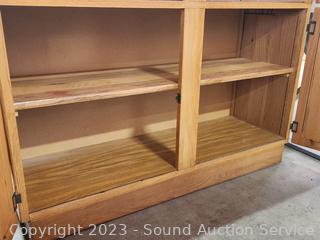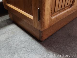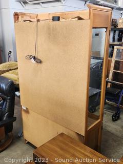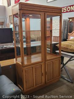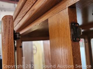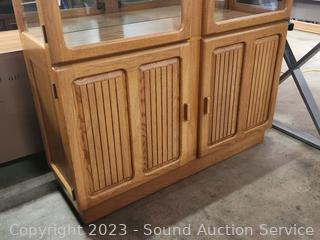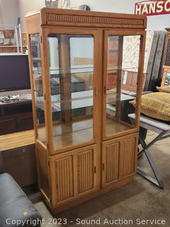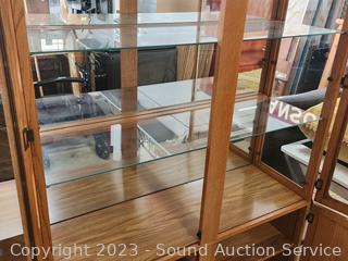 2 Glass shelves, plate grooves. 74.5" H x 43.5" W x 15" D. Don't see any issues. Appears to be solid wood construction.