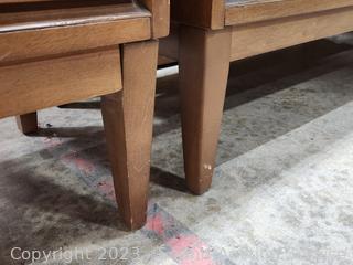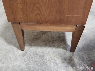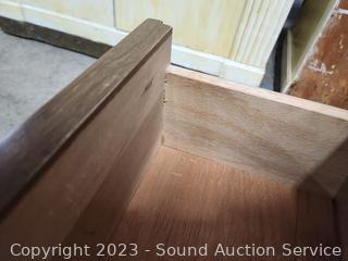 Nightstand has a ding on front left top corner, right side bottom trim & leg is misaligned, hole in back panel. Dresser see a few minor scuffs, overall great condition. Appear to be solid wood construction, dovetail joinery. 23' H x 24" W x 15" D nightstand, 30" H x 56" W x 17.75" D.