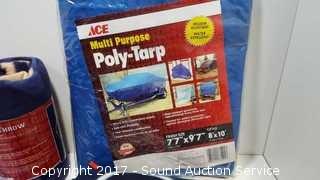 Tarp is 8' x 10'. Also comes with some blue hand towels. Husky throw is still in original package.