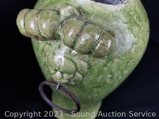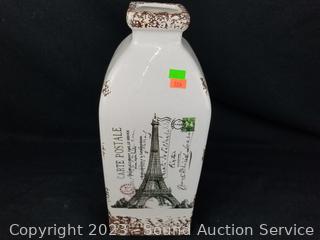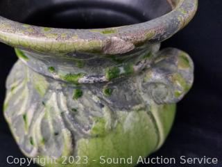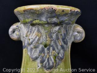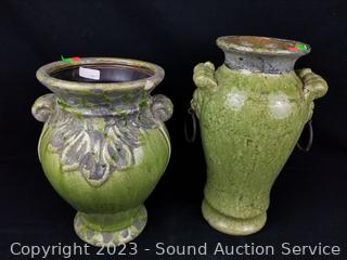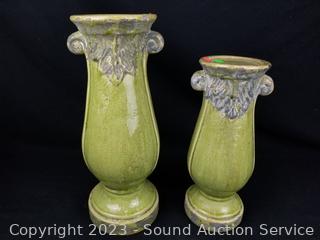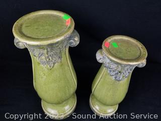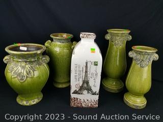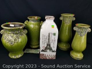 Lot #0062: 2 Vtg. Green Pottery Vases, Candleholders & Paris Postcard Vase