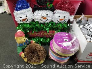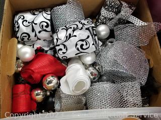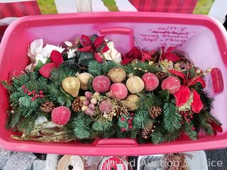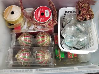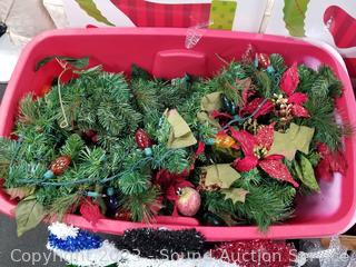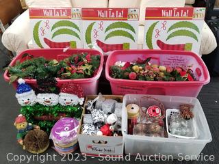 Easy peel wall decor stickers, box of ornaments, ribbon, 1 tote of ribbon, ornaments, 1 tote of faux plant decor, 1 tote with lighted garland & other decor. Refer to photos for more info. 11" x 22" x 16" & 17" x 19" x 31" totes.