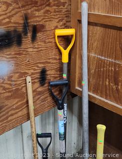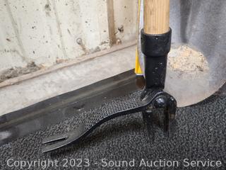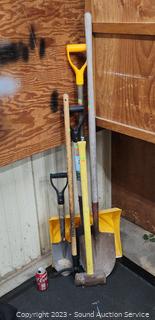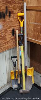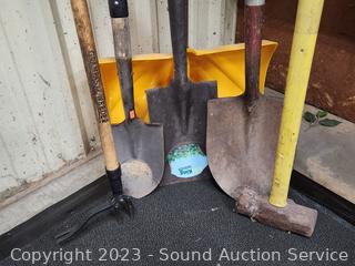 Snow Shovel, spade shovels, sledgehammer & weed puller.