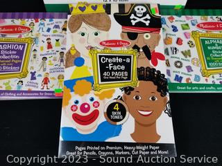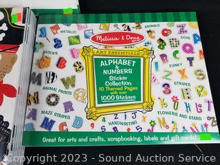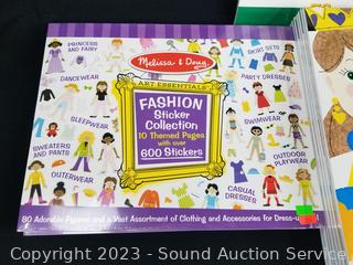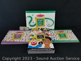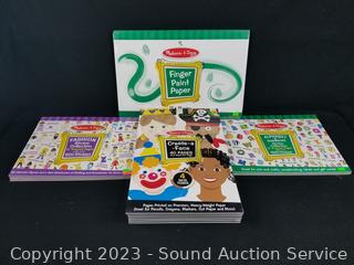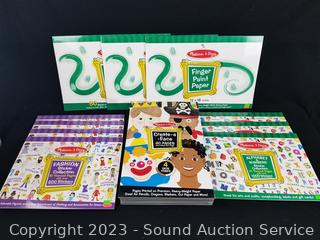 (3) Alphabet & Numbers Sticker books each w/1000 stickers, (4) Fashion Sticker Books each w/600 stickers, (8) Books w/40 pages of faces, (3) books w/50 page 12" x 18" finger paint paper. All are factory sealed.