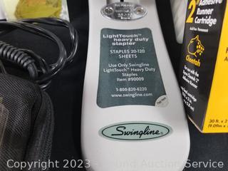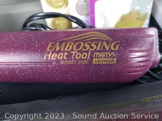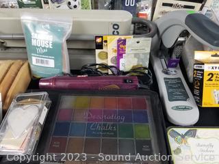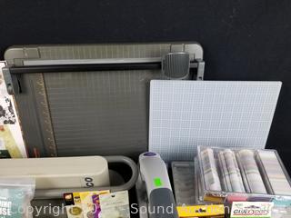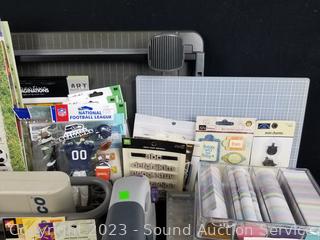 Paper cutter, binder, heat tool, heavy duty stapler, stickers, craft wood & more. Refer to photos for lot contents.