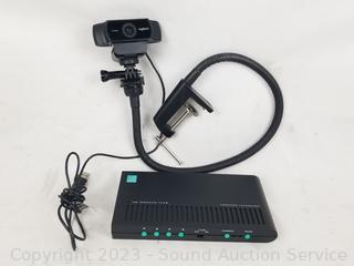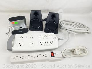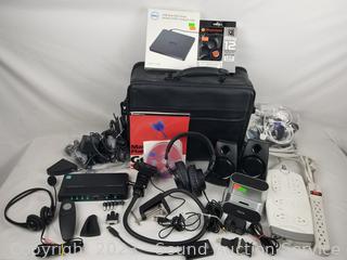 Power strips, media speakers, Slim External DVD drive, iHome dock speaker, Replacement 120mm White LED case fan, VG-DVI & DVI-HDMI adapters, Tascam headphones, 1080p Logitech webcam w/articulating mount, Laptop bag with presenter/marketing accessories.