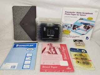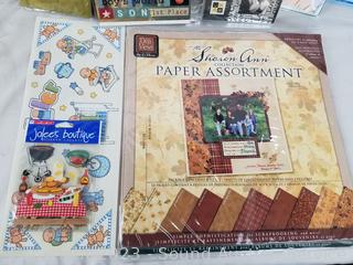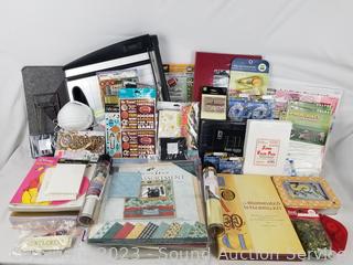 Paper cutter, stickers, assorted mats, paper & more. Refer to photos for lot contents.