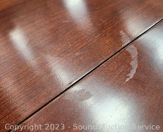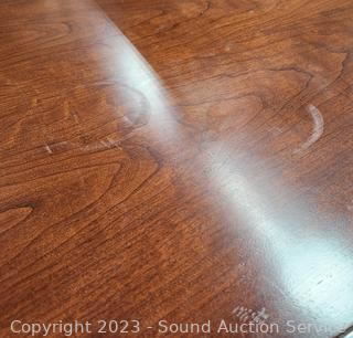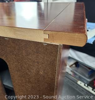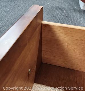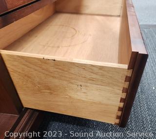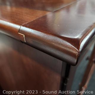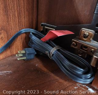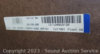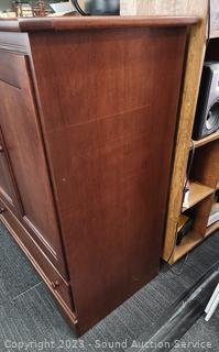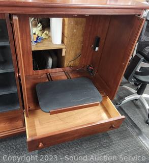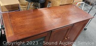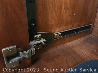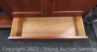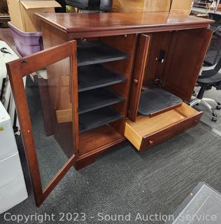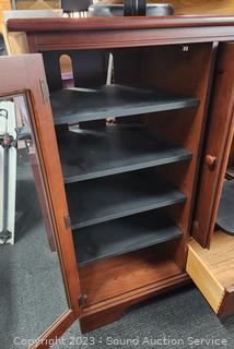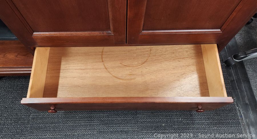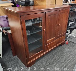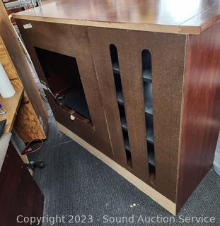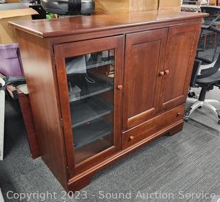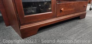 Fits a 28" H x 31" W TV. Single drawer, side cabinet with cord holes. 47" H x 59" W x 21" D. Light wear from use, overall good condition. Appears to be solid wood construction.