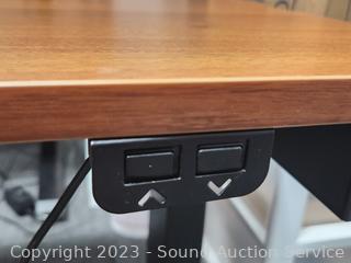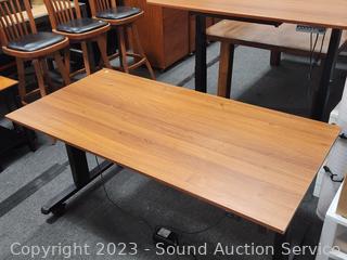 Steel base, wood grain finish. Approx. 29.5" to 44" H x 59" W x 29.5" D. In great cosmetic condition.