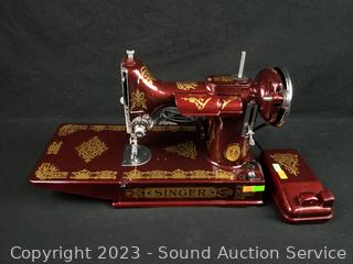 Lot #0080:     Vtg. Burgundy Singer Sewing Machine w/Case & Accessories