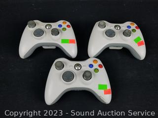 Xbox 360 has no power cord, untested, unknown condition. 2 games are original Xbox. Refer to photos for titles, genre. 3 controllers have various wear.