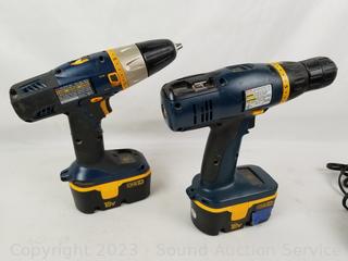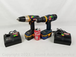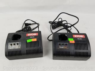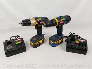 Lot #0185: 2 Ryobi 18v Cordless Drills w/2 Batteries & 2 Chargers