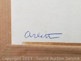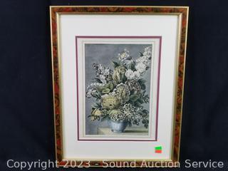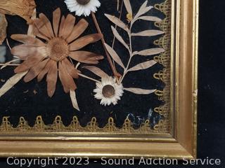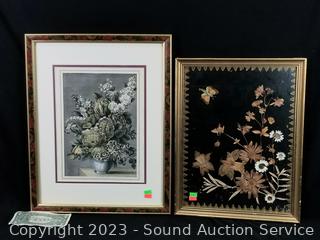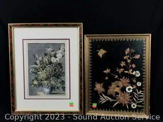 One crafted with real flowers and foliage, 13"x 17", some scuffs on frame. Other looks to be an etching, don't see any signatures or makers marks, 19.5" x 15.5".