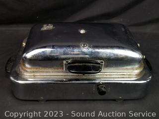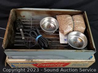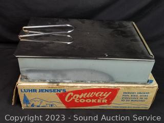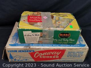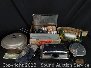 Mirro Cookie/Pastry Press, Conway Cooker hickory Smoker, Waffle Maker (works), Boy Scouts Mess Kit, Kinney 11" Aluminum Skillet w/Lid (signs of wear from use).