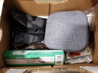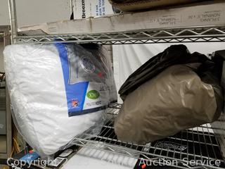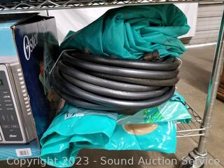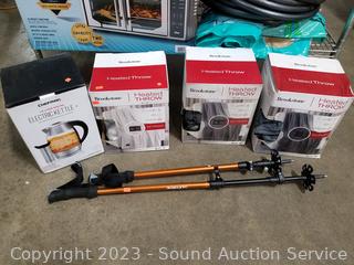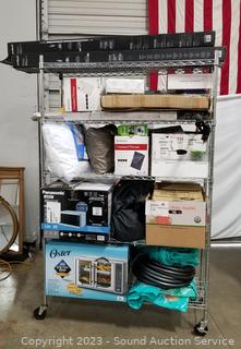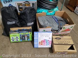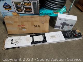 Stainless microwave, air fry oven, LED/RGB strip lights, 100ft garden hose, air mattress, trekking poles, electric kettle, cordless massager, PureLux Memory Foam shapeable pillows, heated throw, tower fan, sheet set, Artika Neptune shower caddies & more. ATTN: Items may be missing pieces, damaged, not functioning, complete, no issues, etc. All items as is. Refer to photos for lot contents. Cart NOT included.