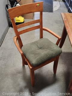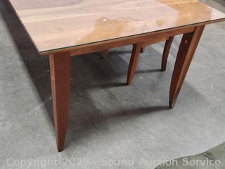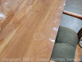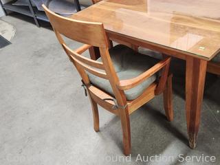 Beautifully crafted. Chairs all have tie-on chair pads, 2 chairs are captains chairs. Table comes with protective glass top when fully extended. 2 removable 18" leaves. 30" H x 8ft x 42". Some of the legs of table and chairs has some staining or dirty, otherwise in great condition.