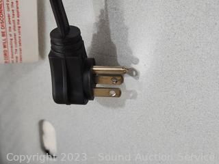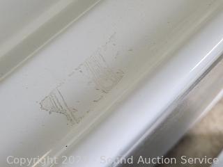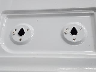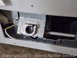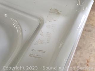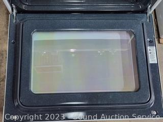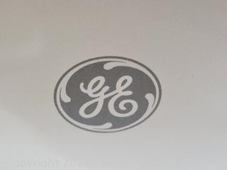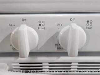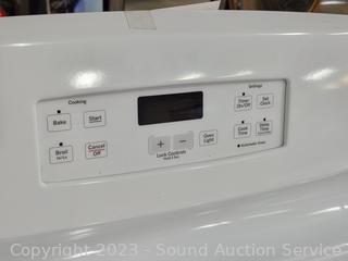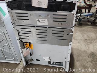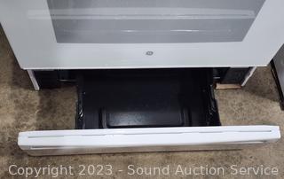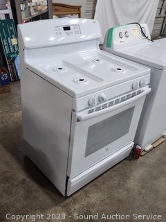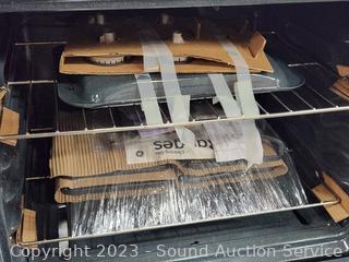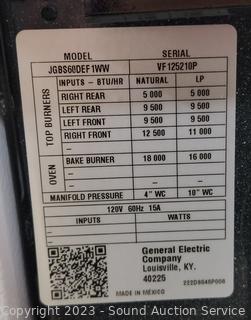 Has power, otherwise untested. We removed it from packaging for photos. Appears new unused, some sticker, tape residue on the top. Appears complete, burners & grills inside oven. 45.5" H x 30" W x 25" D. Model JGBS60DEF1WW, Serial VF125210P.