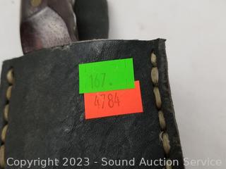 Approx. 5.5" & 7.5" long overall. Snub nose has a signature on blade D & E something. Both with leather sheathes.