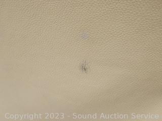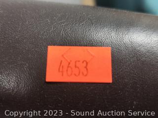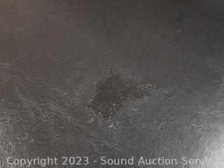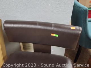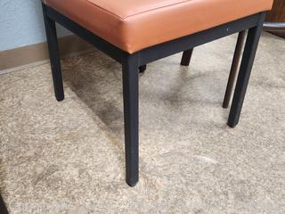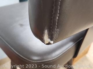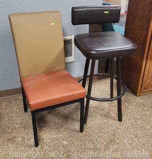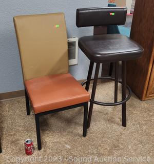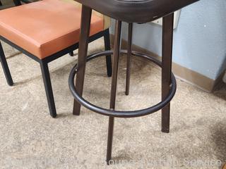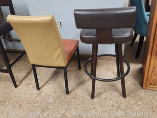 Orange/Tan 37' H x 17.5" W x 18" to seat, some minor scuffs, Brown Swivel Bar Stool 39" H x 18" W x 30" to seat, some minor scuffs, small hole.