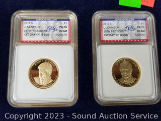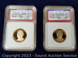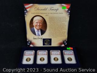 Lot #0103: 4 Graded PR-70 FDI Presidential Dollars & Trump Medallion