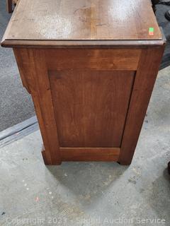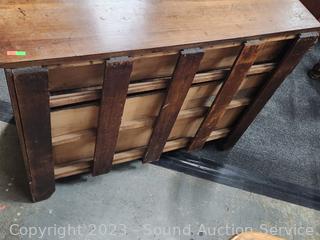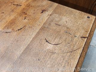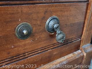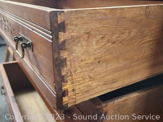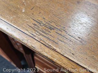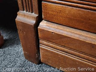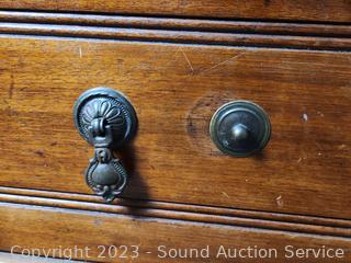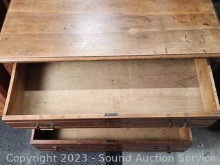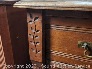 Skeleton key locks, carved accents, solid wood construction. 30" H x 40" W x 18" D. Various stains, wear to finish.