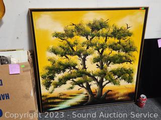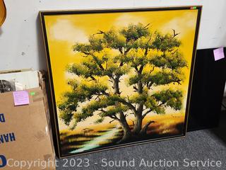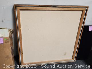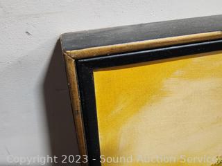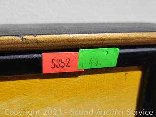 Has a repaired hole. not very noticeable, could probably touch up with some paint on your own and not see it at all. Some scuffs, wear to gold finish on frame. 37" x 37".