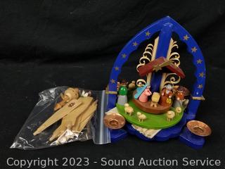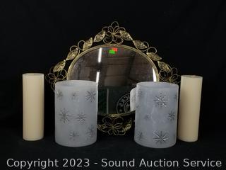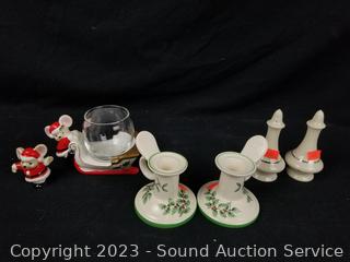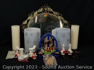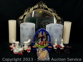 2 Wax luminaries, 2 pillar candle holders, 2 ruby red candle holders, 2 Spode Christmas Tree candleholders, 2 salt & pepper shakers, fits & Floyd votive, wood nativity candle spinner, decorative mirror.