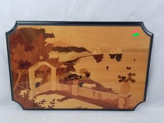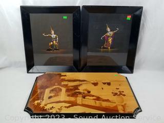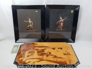 The Marquetry is made in Italy, don't see a signature, 14.5" x 22". Both the Buddhist Thai paintings appear to be originals, 16.5" x 13.5", some scuffs on frames.