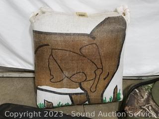 Allen 50" x 9" case, Black 34" x 11.5" case, Allen 42" x 29" crossbow case, 20" x 20" x 7" target. Signs of wear from use, overall good condition.