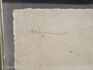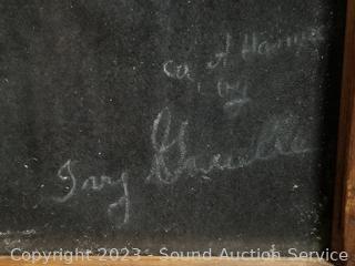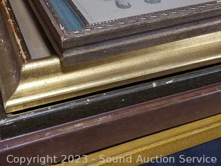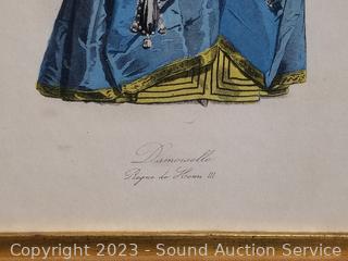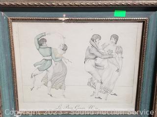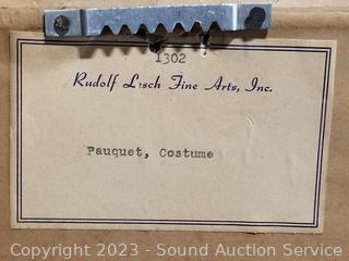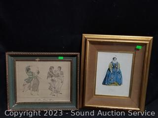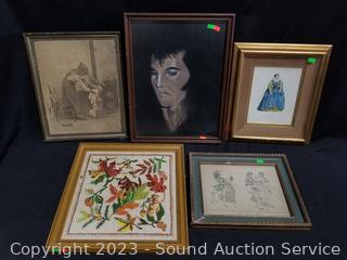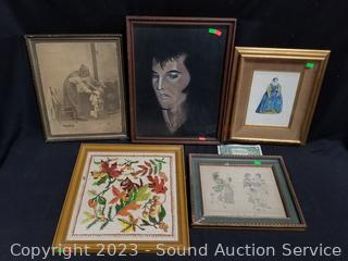 15" x 15" embroidered squirrel artwork. Signed Elvis drawing, 17" x 13", refer to photos for signature. Child Bathing Photo?, 15" x 12", Pauquet Costume, Dameiselle print, 14" x 11.5". Vtg. Dancers etching, 10.5" x 12.5". Some scuffs, wear to frames. Refer to photos for more info.