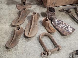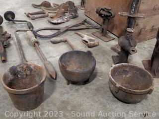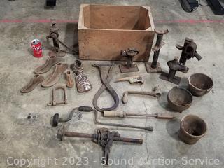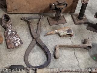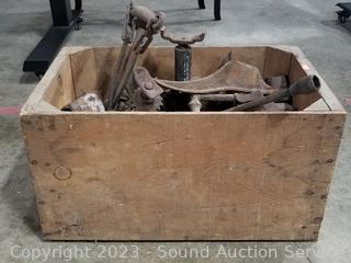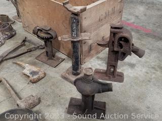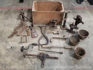 Jacks, smelting pots, shoe anvils, mattock, wood crate 10.5" x 19.5" x 12". Refer to photos for more info.