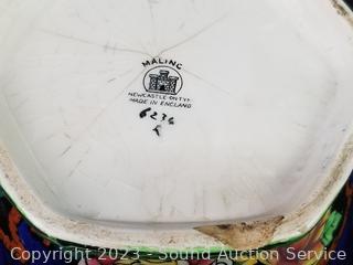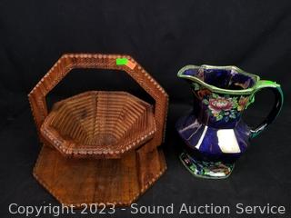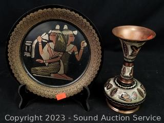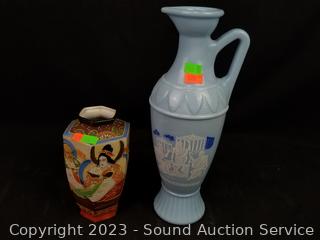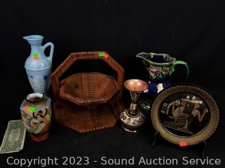 Etched copper vase, Made in Japan ceramic vase, blue glass Greek vase, Maling England floral pitcher (small chip on the bottom).