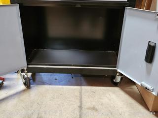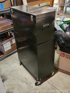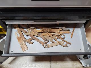 40" H x 24" W x 11.5" D. Locking with keys. Various wrenches & sockets.