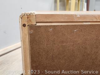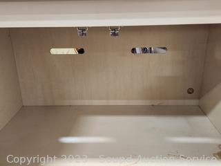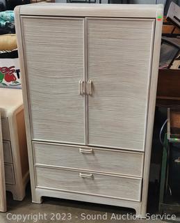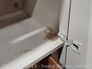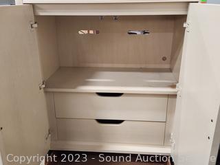 59" H x 35.5" W x 19" D. Some staining on the interior shelf & lower drawer.