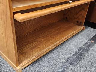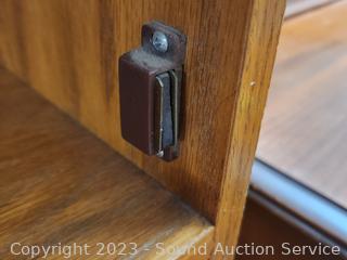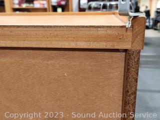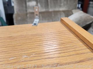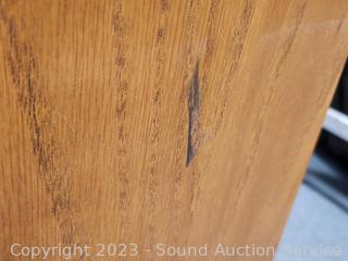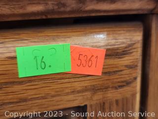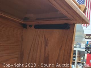 Solid & particle board construction, side panels are particle board & oak veneer, the rest appears to be solid wood, well made, in great condition. Top side panels had stickers on the, and stain is faded where they were removed. 59" H x 35.5" W x 12" D.