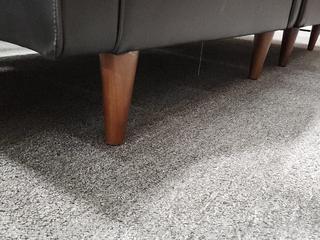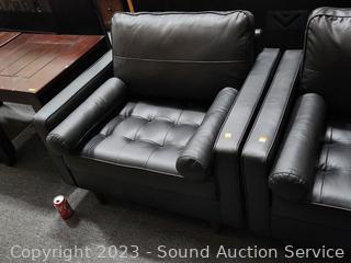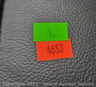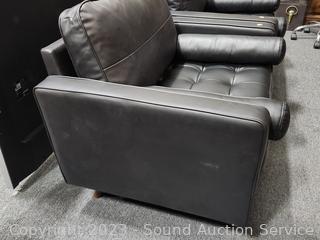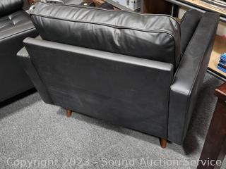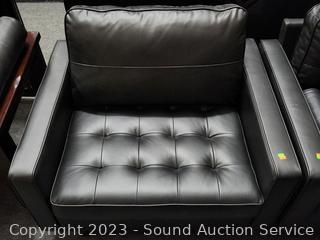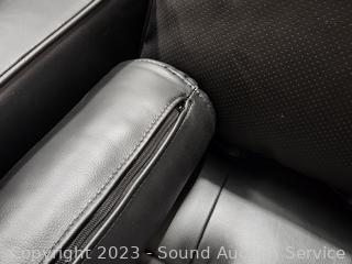 Appears to be genuine leather. In excellent condition. Don't see any issues. 26.5" x 37.5" W x 17" to seat.