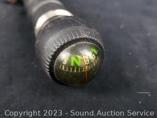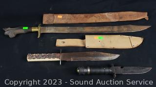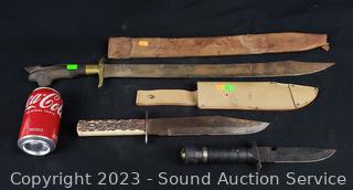 Sword is etched "Philippines", wood handle, brass hand guard, leather sheathe, overall 27.5" long. 15" bowie knife, don't see any makers marks, 11.5" survival knife, nothing in handle, made in Taiwan. All have various rust, wear.
