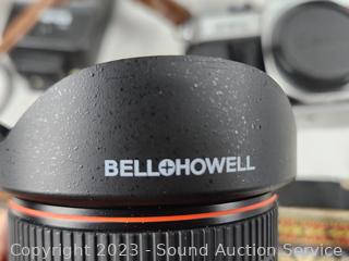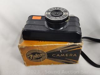 Falcon miniature camera, comes with original box. Canon FD 50mm 1:1.8 lens, Super Dejur MC 1:2.8 f=28mm lens, Dejur 1:2.8 f=135mm lens, Bell & Howell 8mm 1:3.5 Fish-Eye lens, flash, teleconverter, motor winder, filter, strap, mounting plate, camera bag.