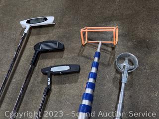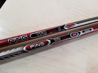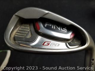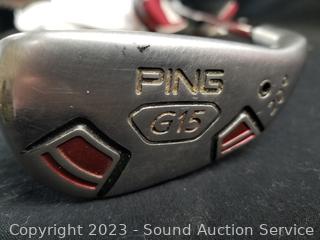 2 Nice bags, one with a complete set of Ping clubs, both with various accessories, balls, gloves, pencils, cleaner, pitchfix, rules of golf book, ping clubs all have protective sleeves. Believe they are men's clubs. Refer to photos for more info.