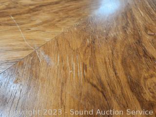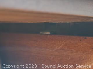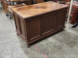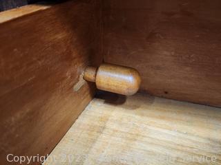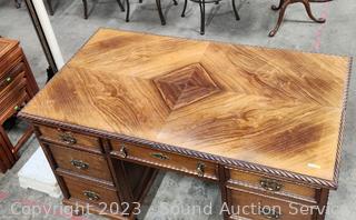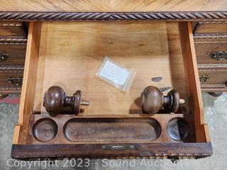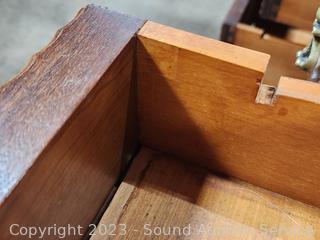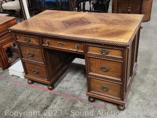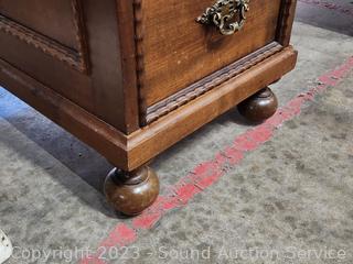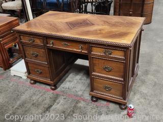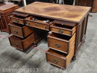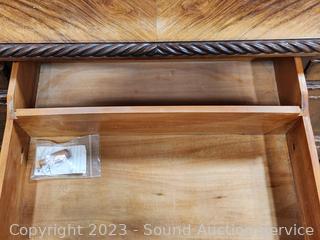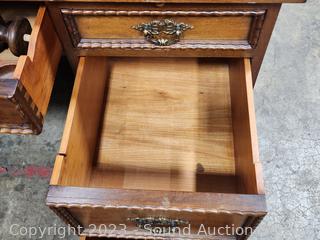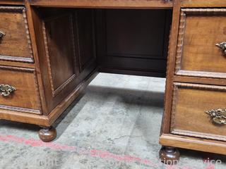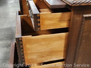 Carved twisted edge, ribbed trim, solid oak construction, dovetail joinery. Center drawer needs to be opened for other drawers to open, 1 pull out tray on each side. Some scuffs, wear to finish. 31" H x 51" W x 28.5" D.