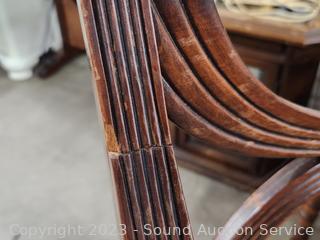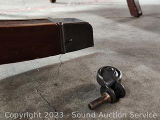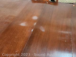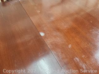 Various wear to finish from age, use, scuffs, wear, fading. Table has steel casters. 30" H x 66" x 42" with (2) 12" leaves. 2 of the chairs are captains chairs, 1 is missing a chunk of wood on right arm. Refer to photos for more info.