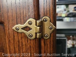 65" H x 27" W x 21" D closed. Desk table folds into the door, 31" H x 31" W x 17.5" D. 2 of the shelves, roll out. Various scuffs, wear to finish.