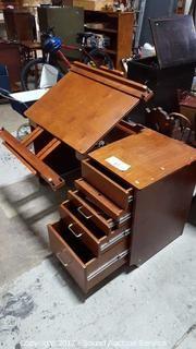 Very nice piece. In very good condition. Approx. $860 retail value. The large adjustable work top can hold canvases, panels, drawing pads, watercolor paper, and more. The Multimedia Center can be assembled for right or left handed artists and was designed to work with most adjustable office chairs. Features: Table height when flat 29"; Table height of side table 27 3/4"; Large 24” x 31 1/2” work top can hold a wide range of painting and drawing sizes.; Two 34 1/2” sliding support arms can hold small to large supports at any height on the table. ; The support arms can be used in either direction. One side has a 1 1/2” wide ledge for stretched canvas, the other side a 1/2” ledge for thin painting panels or illustration board. The work top adjusts from flat to 12 different angles. The work top can also be held at a fixed vertical position. Top and bottom support holders are built into the work top that extend 19” above and below for extra large work. The 18” x 22” side table is perfect for holding supplies, solvent containers, and other art necessities.