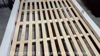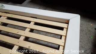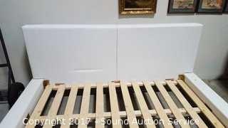Comes with headboard, footboard, side rails, and slats. Some scuffs in the upholstery, please refer to photos. Left rail (facing the bed), has a break in it. Headboard is approx. 31.5" tall.