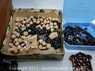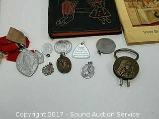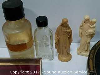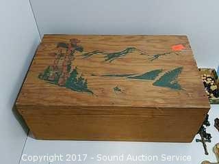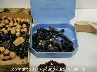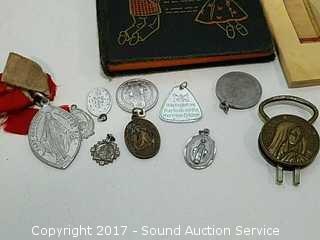 Includes: holy water, rosaries, pins, necklaces, saint charms and more. All in a wooden box with a totem print on the top.