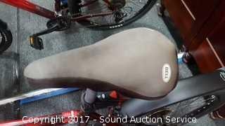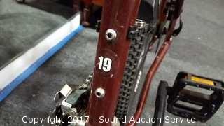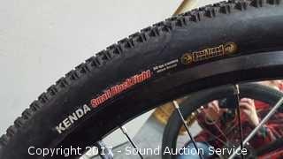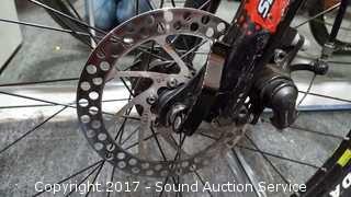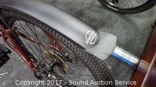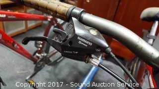 Mountain bicycle. Has disk brakes, mud flaps, Shimano shifters and brakes, aluminum frame, 19" from center crank to seat post. Needs new grips.
